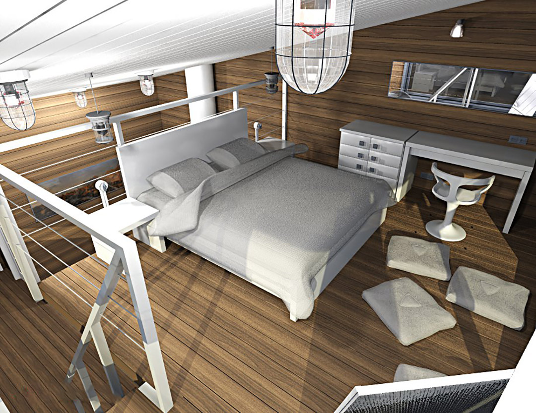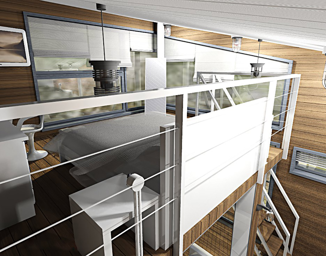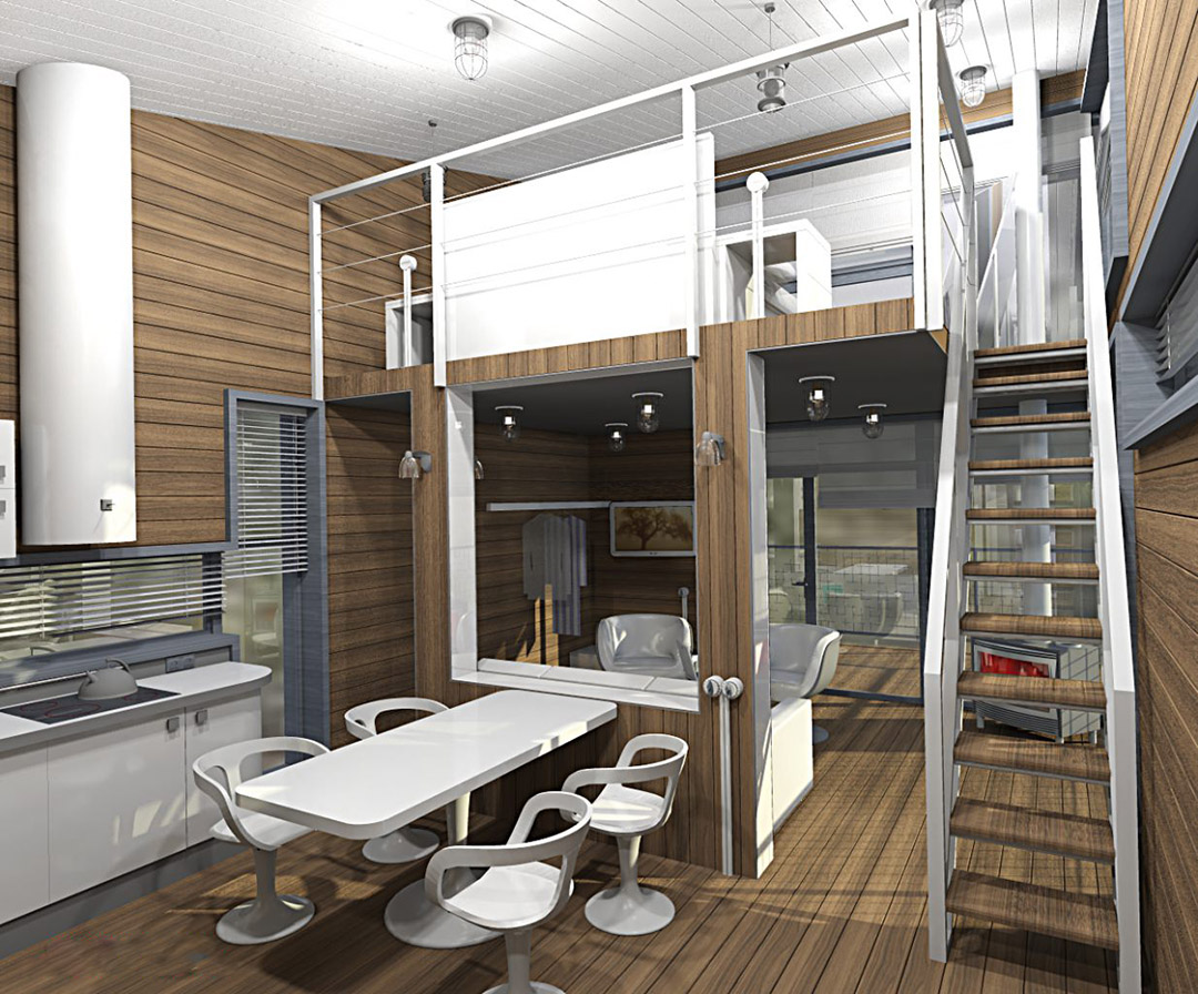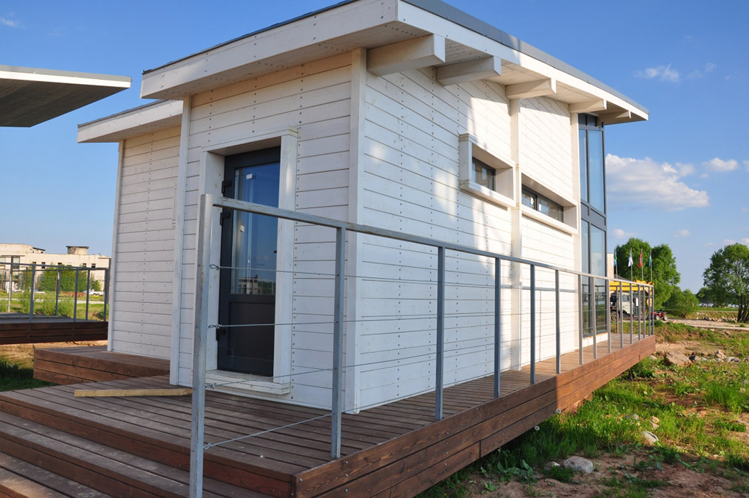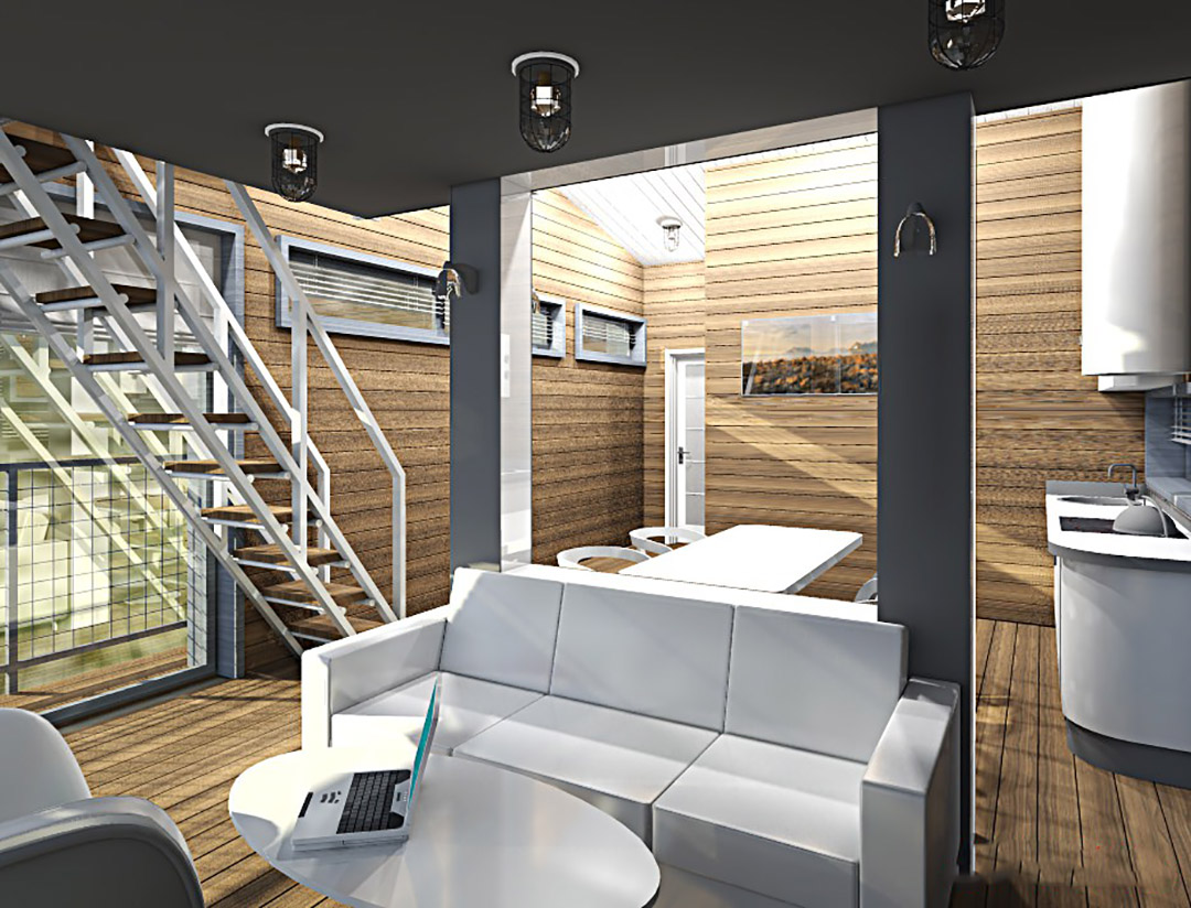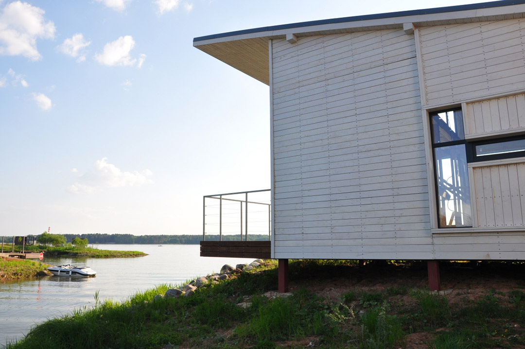 The structural solution of the building is made by the frame-shield Canadian technology. Marina houses have two levels. There is a vestibule, an entrance hall, a living room, a kitchen-dining room, a bathroom, and technical facilities on the 1st floor. The second floor, designed in the form of the mezzanine, has the bedroom.