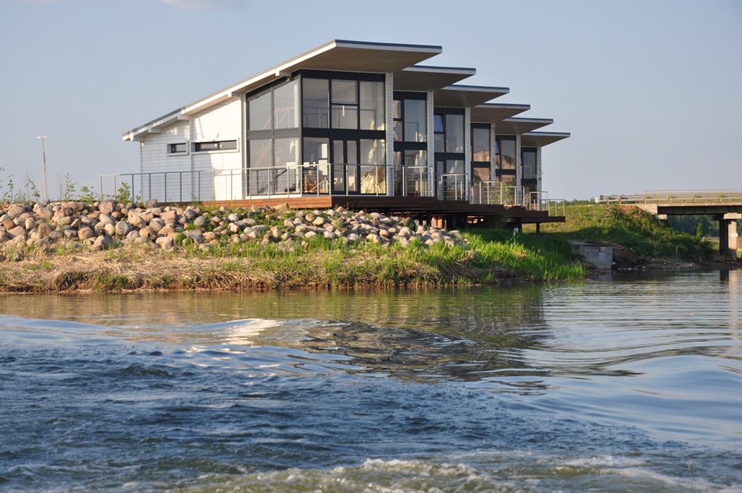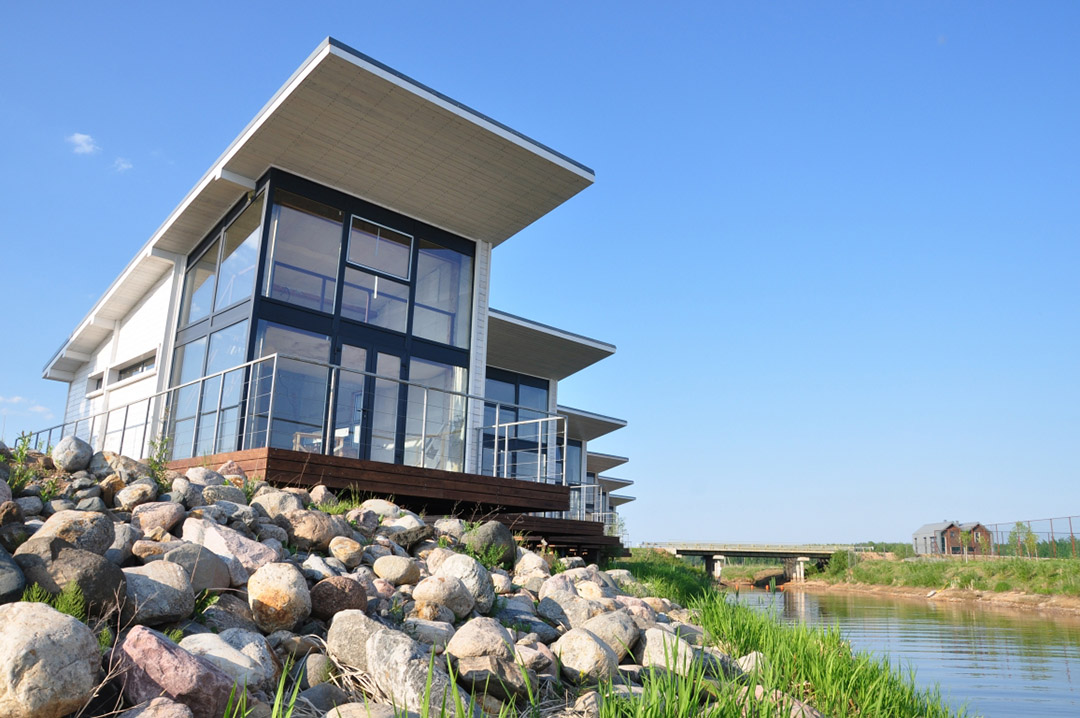 Marina houses lined up in the coastal zone of the river, along the natural water channel, are a beautifully designed steel fabrication by a well-known architect.
