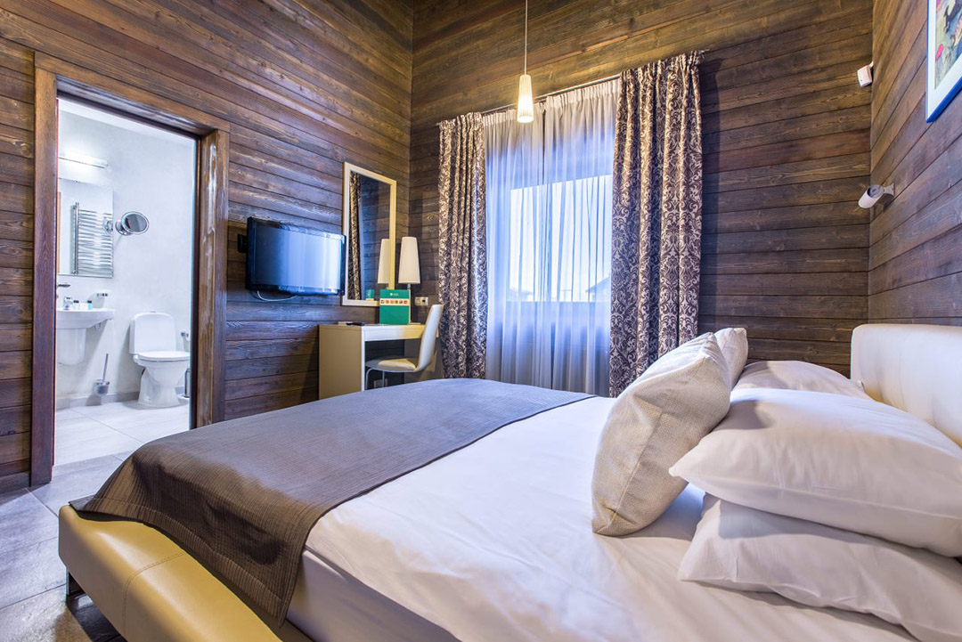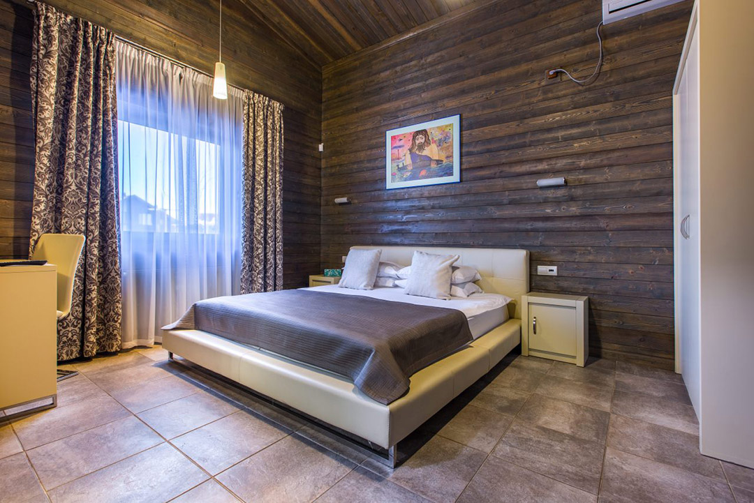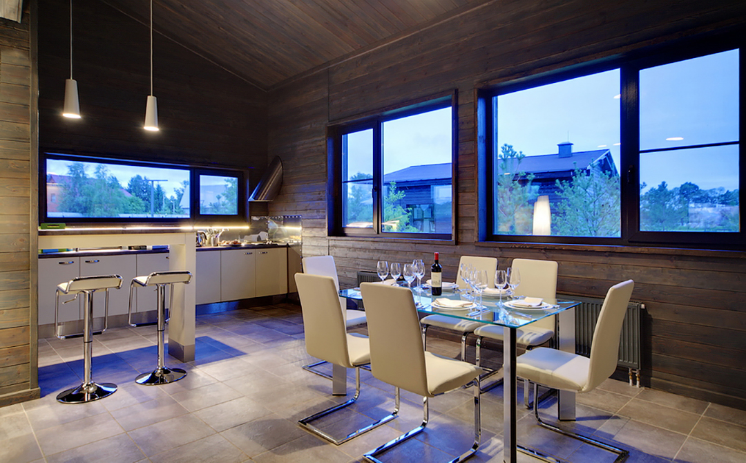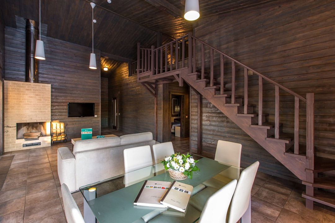 The Finnish houses are built in a pseudo-Finnish style with the use of many natural materials in the exterior and interior design. One-story cottage, which is similar to container homes, has a large living area with panoramic window walls, which can be opened during the warm season to let the fresh air into the house. Every small detail of the interior highlights the extraordinary coziness of the house. The houses are perfect for a family holiday and a holiday with friends. The small staircase from the living room leads into the cozy attic where you can accommodate guests or children. The Finnish houses are designed to accommodate 4–7 people.