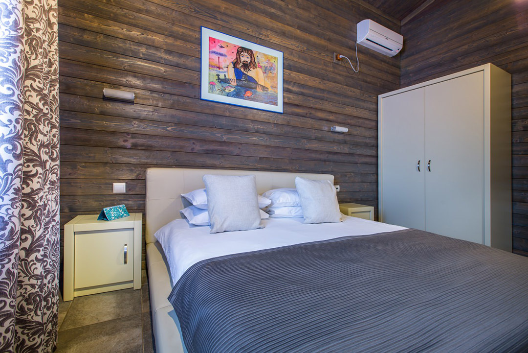 There are only 6 cottages. A three-room cottage has an entrance hall, a living room with a kitchen set, two bedrooms, an attic with a sleeping area, and a bathroom with a shower. The living area of the cottage is 145 square meters.